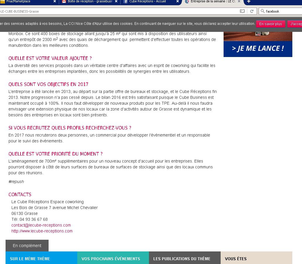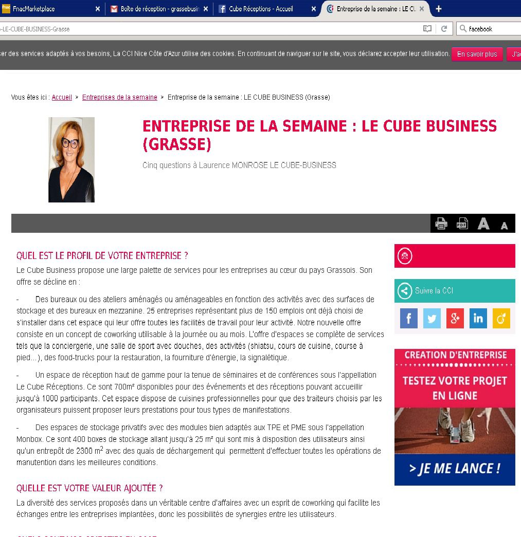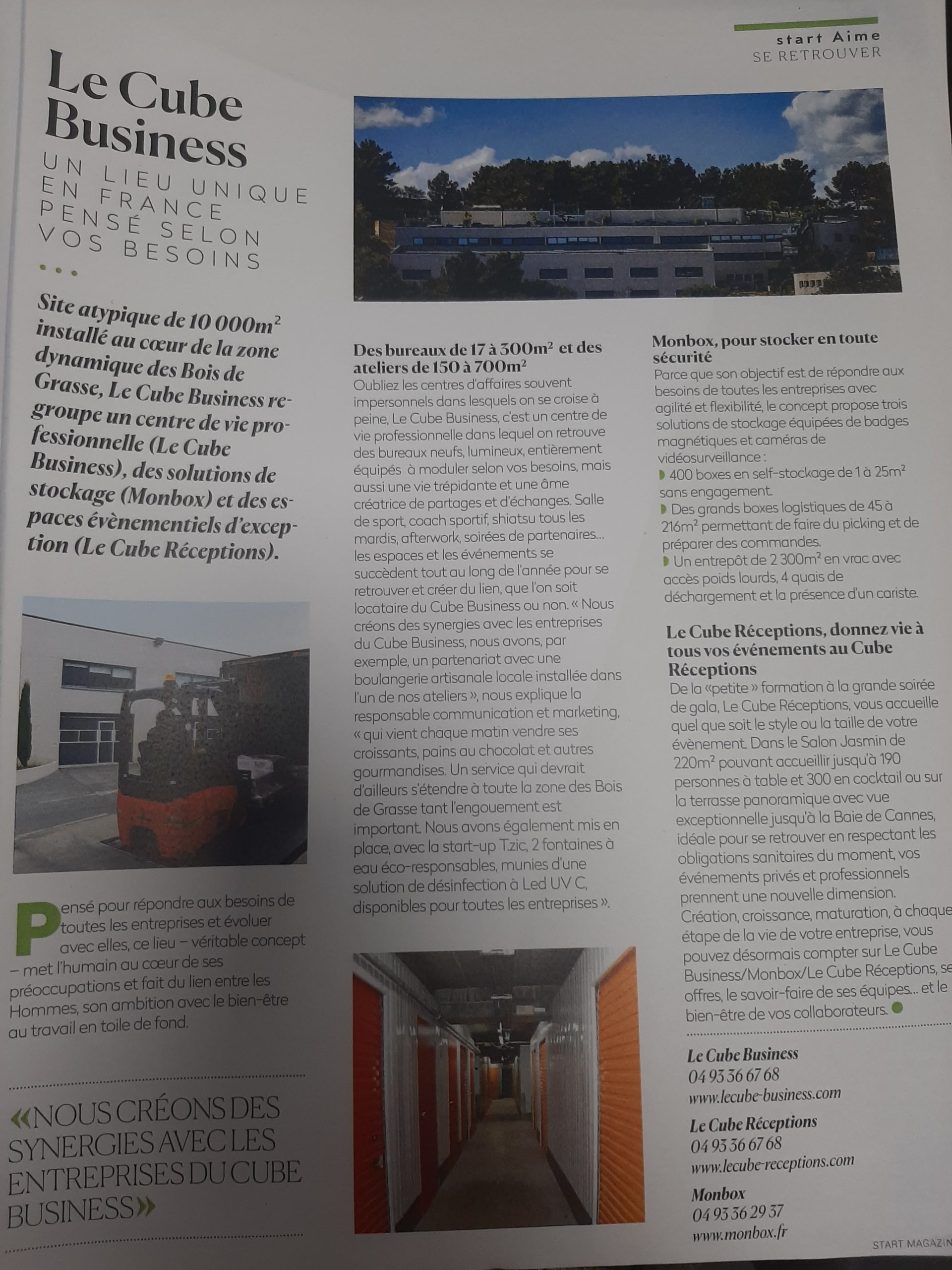 Le Cube Business propose un concept novateur, unique sur la Côte d’Azur. Sur un même site de 10 000m2 au cœur du parc d’activité des Bois de Grasse, le centre de vie professionnelle offre un panel de services aux entreprises pour une totale flexibilité : la location de bureaux, d’ateliers, de salons de réception, de salles de réunion, d’un espace coworking et de solutions de stockage, un service d’accueil et de conciergerie, des activités sportives, de loisir et de bien-être et des rendez-vous networking, pour organiser, dans les meilleures conditions, une activité de service, commerciale, administrative ou artisanale.